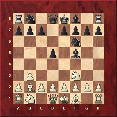 1.Cf3 d5 2.b3 Cf6 3.Fb2 Ff5 4.g3 e6 5.Fg2 h6 6.O-O Fe7 7.d3 O-O 8.Cbd2 Fh7